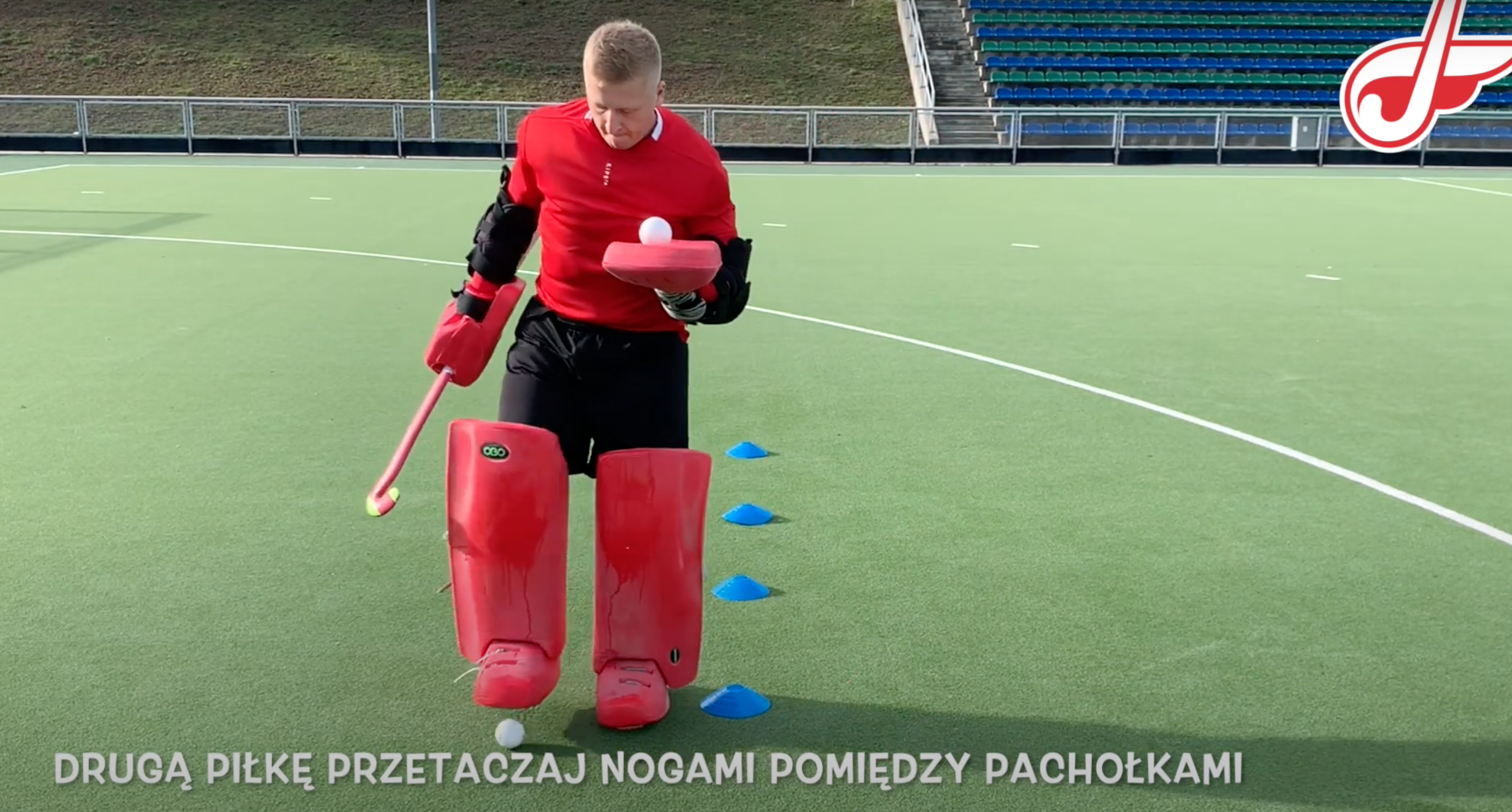 Do tego ćwiczenia potrzebujesz 2 piłek hokejowych/tenisowych oraz 4 pachołki. Utrzymując jedną z piłek na lewej rękawicy, drugą wykonaj slalom pomiędzy pachołkami używając wykopów.