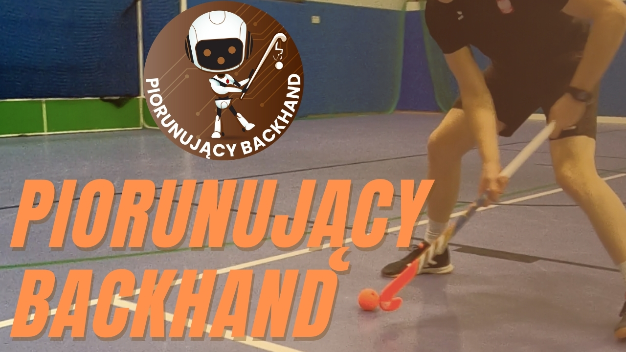 Do tego ćwiczenia potrzebujesz piłkę hokejową. Stań na szczycie półkola strzałowego tyłem do bramki i wykonaj 3 pchnięcia piłki backhandem do bramki.