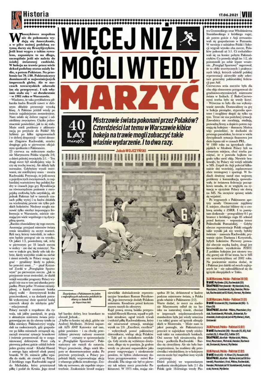 W tym roku mija 40 lat odkąd reprezentacja Polski w hokeju na trawie po raz ostatni wygrała z Mistrzami Świata. W 1981 roku pokonaliśmy dwukrotnie Pakistan w… Warszawie. Bramki dla biało-czerwonych zdobywali wtedy między innymi Zbigniew Rachwalski czy Andrzej Myśliwiec.